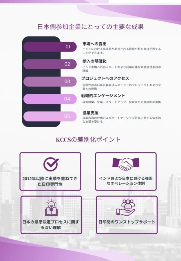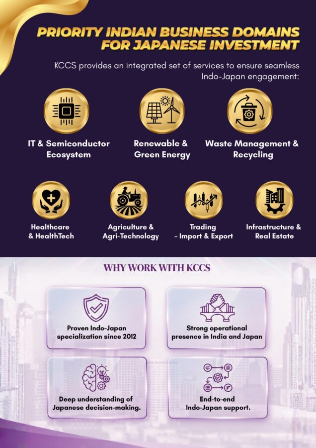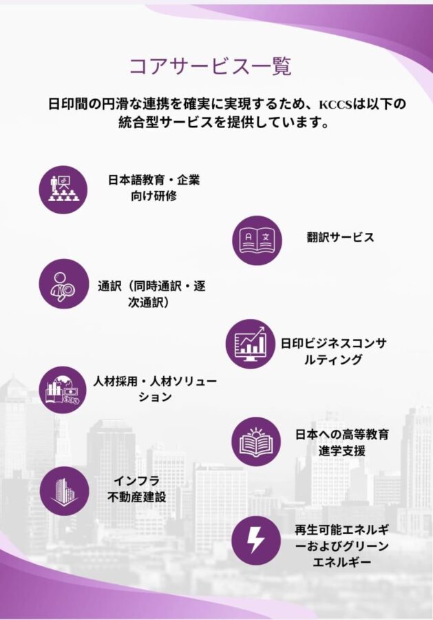 言語・文化・ビジネスの架け橋として、KCCSはインドと日本の間をつなぎ、50万人の若いインド人材の雇用ニーズに応えるとともに、両国のビジネスの成長と二国間貿易の発展を支援しています。